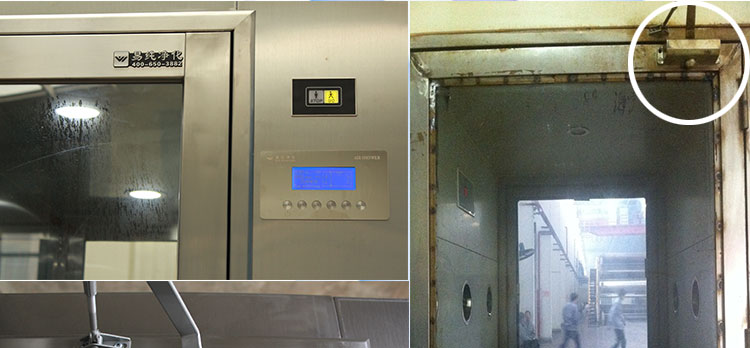 20. 安全措施:內部安裝有紅色”急停“按鈕,緊急情況下按下按鈕,系統斷電雙門可同時打開利于逃生;