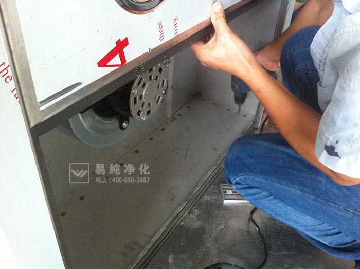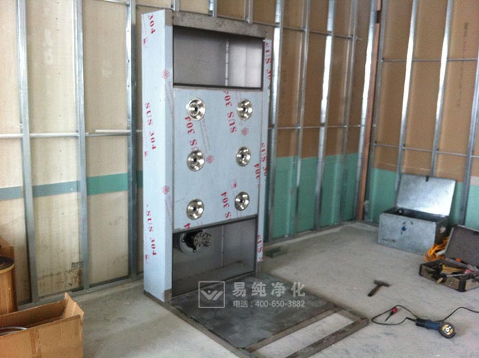 (一)風淋底盤一般由不銹鋼方管制作,厚度為40MM,底盤為整體組成,首先將風淋底盤置于風淋安裝位置處。風淋底盤不需要與地面進行固定,完全靠自身重量即可保持穩固。一般單人風淋室為350KG,雙人風淋室為650KG左右。